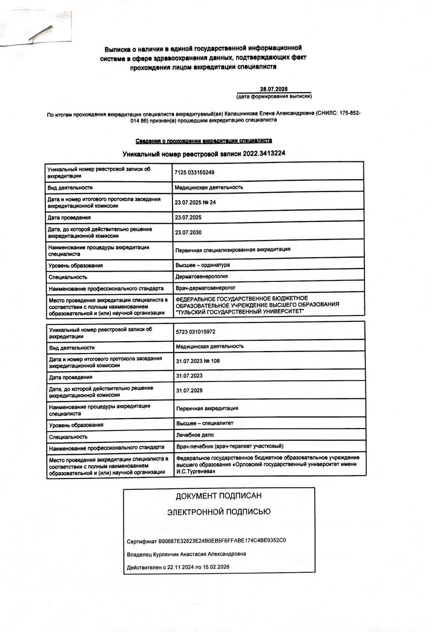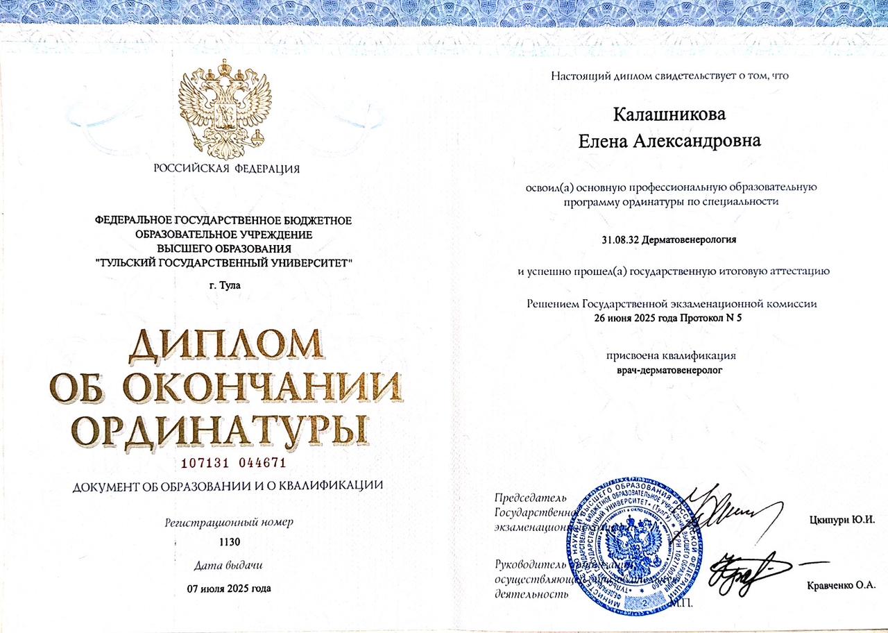 Калашникова Елена Александровна — врач-дерматовенеролог и врач-косметолог с фундаментальным медицинским образованием, специализацией в дерматовенерологии и серьезной подготовкой в области эстетической медицины.