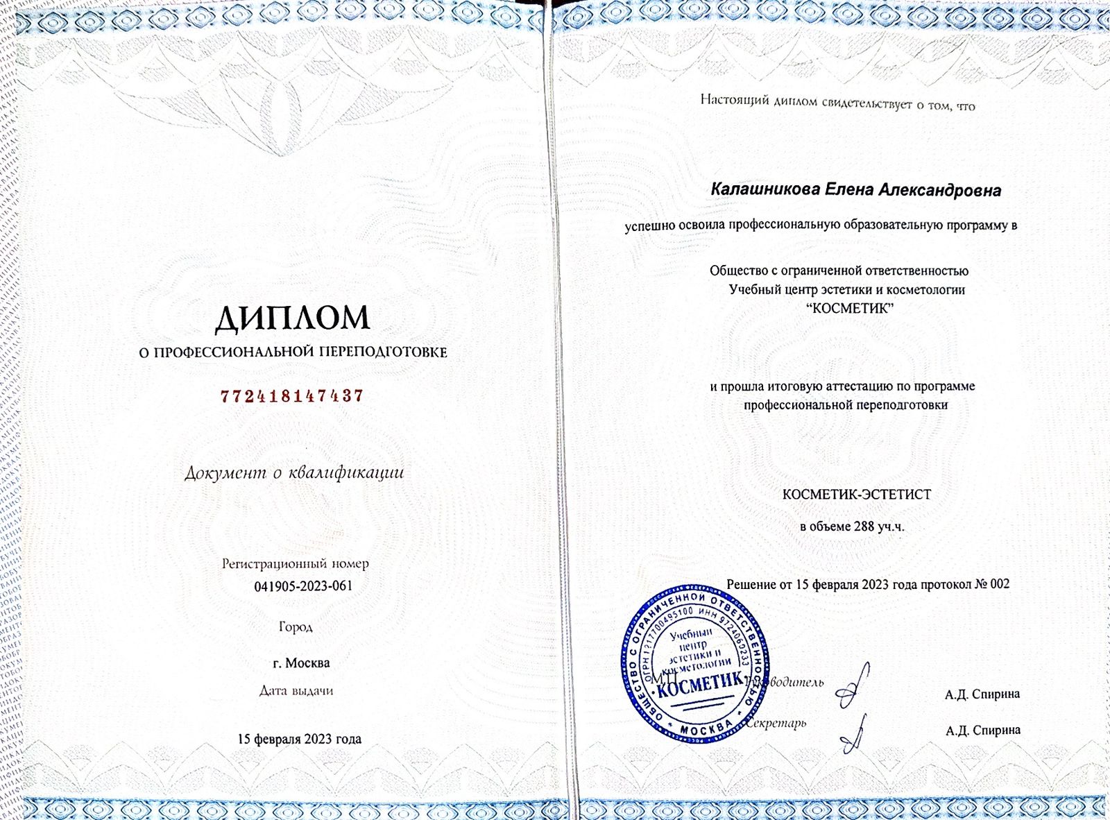 Имеет диплом о профессиональной переподготовке по программе «Косметик-эстетист» (Учебный центр «КОСМЕТИК», 2023 г.).